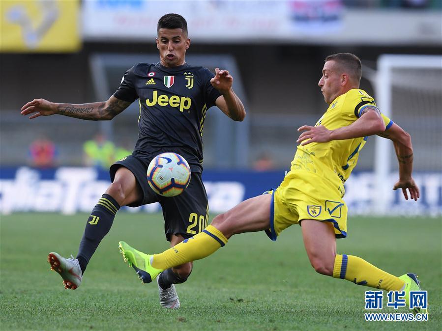 ↑8月18日,尤文图斯队球员坎塞洛(左)和切沃队球员贾凯里尼在比赛中拼抢。新华社发(阿尔贝托·林格里亚摄)