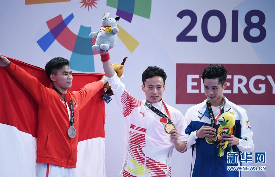 8月19日,冠军中国选手孙培原(中)、亚军印度尼西亚选手埃德加(左)和季军中国台北选手蔡泽民在颁奖仪式上。新华社记者李响摄