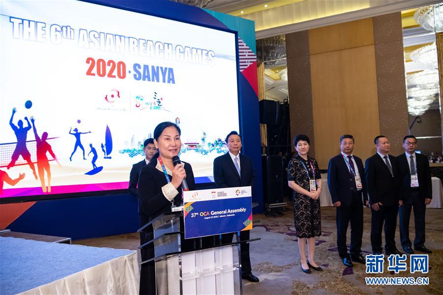 8月19日,三亚市副市长许振凌(左二)在代表大会上发言。 当日,在印尼首都雅加达举行的第37届亚奥理事会代表大会上,亚奥理事会成员经过投票,通过了在三亚举行第六届亚洲沙滩运动会的决定,时间定于2020年11月底至12月初。 新华社记者张金加摄