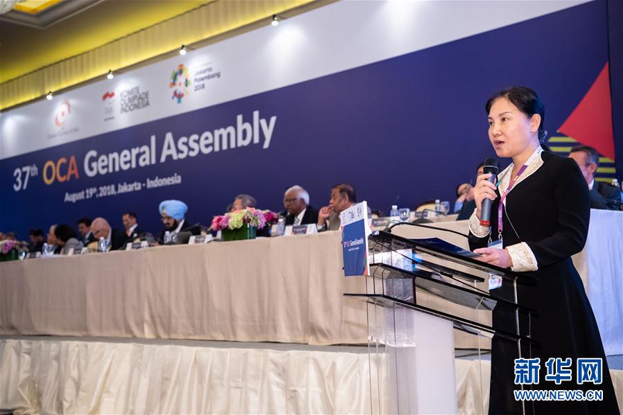 8月19日,三亚市副市长许振凌在代表大会上发言。 当日,在印度尼西亚首都雅加达举行的第37届亚奥理事会代表大会上,亚奥理事会成员经过投票,通过了在三亚举行第六届亚洲沙滩运动会的决定,时间定于2020年11月底至12月初。 新华社记者张金加摄
