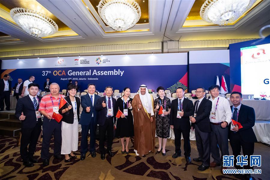 8月19日,亚奥理事会主席艾哈迈德亲王(右六)与三亚市代表团成员合影留念。 当日,在印度尼西亚首都雅加达举行的第37届亚奥理事会代表大会上,亚奥理事会成员经过投票,通过了在三亚举行第六届亚洲沙滩运动会的决定,时间定于2020年11月底至12月初。 新华社记者张金加摄