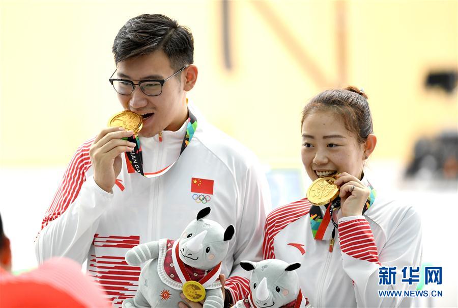 8月19日,获得冠军的中国选手纪晓晶(右)、吴嘉宇展示金牌。 当日,在第18届亚运会10米气手枪混合团体赛决赛中,中国选手纪晓晶、吴嘉宇以473.2环的成绩夺冠。 新华社记者程敏摄