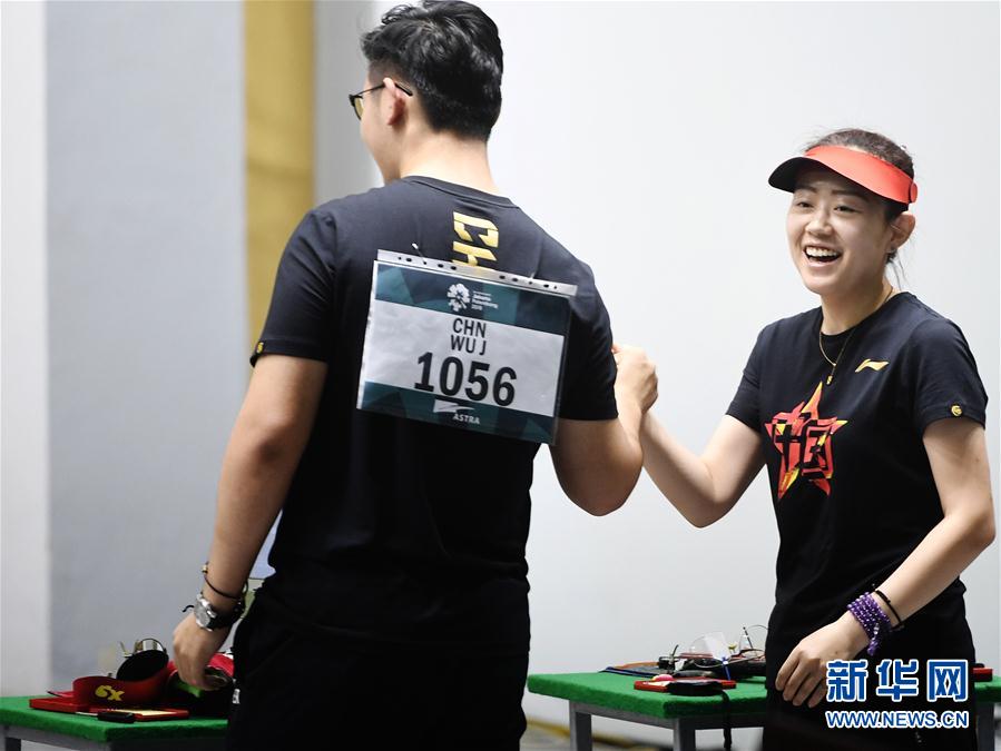 8月19日,中国选手纪晓晶、吴嘉宇(左)在夺冠后庆祝。当日,在第18届亚运会10米气手枪混合团体赛决赛中,中国选手纪晓晶、吴嘉宇以473.2环的成绩夺冠。新华社发(王申摄)