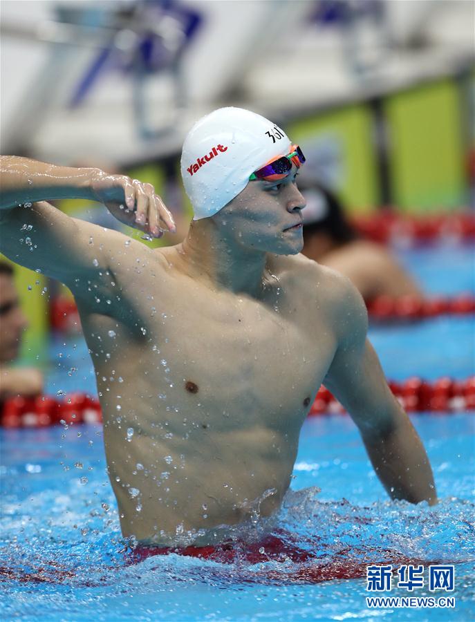 8月19日,中国选手孙杨在赛后庆祝。当日,在第18届亚运会男子200米自由泳决赛中,中国选手孙杨以1分45秒43的成绩夺冠。新华社记者费茂华摄