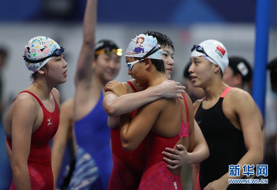 8月19日,中国选手朱梦慧、吴越、杨浚瑄、和吴卿风(从右至左)在比赛后。 当日,在第18届亚运会女子4X100米自由泳接力决赛中,中国队以3分36秒78的成绩获得亚军。 新华社记者费茂华摄