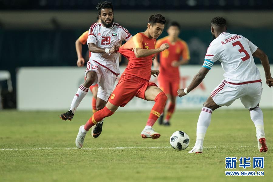 8月19日,中国队队员韦世豪(中)在比赛中带球突破。 当日,在第18届亚运会男子足球C组小组赛中,中国队以2比1战胜阿联酋队。 新华社记者吴壮摄