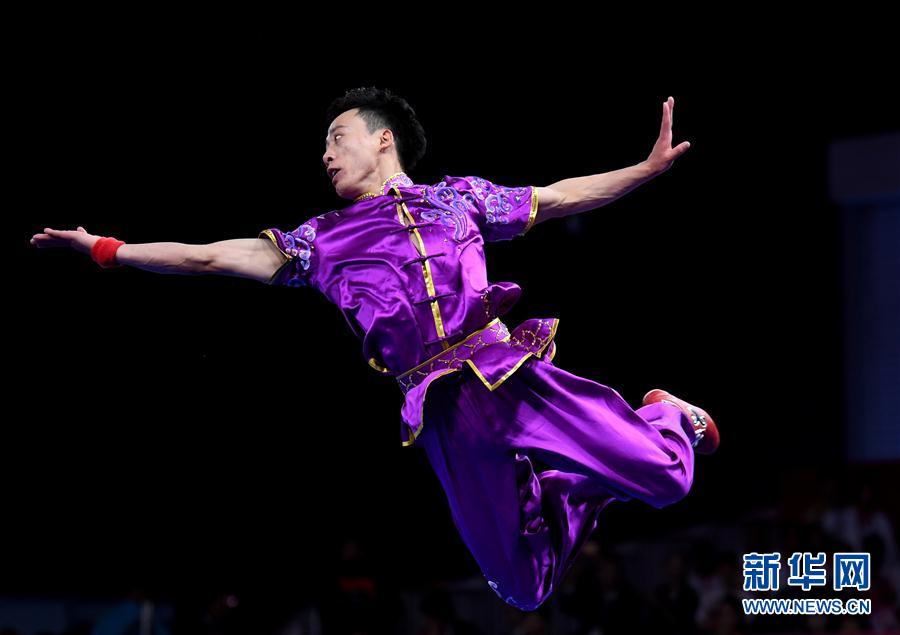 8月19日,中国选手孙培原在比赛中。当日,在第18届亚运会武术男子长拳决赛中,中国选手孙培原以9.75分的成绩获得冠军,本届亚运会首枚金牌产生。新华社记者潘昱龙摄