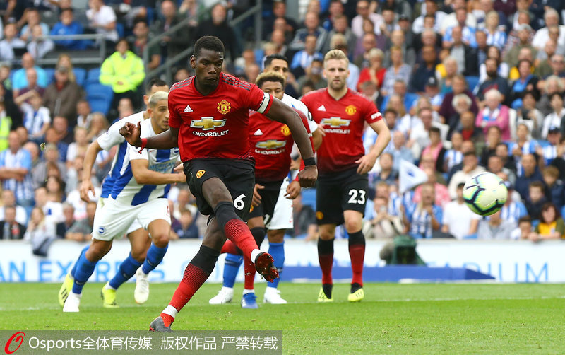 第95分钟,达菲禁区内对费莱尼犯规,博格巴主罚点球命中,2-3。最终,布莱顿主场3-2力克曼联拿到3分。
