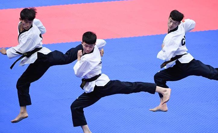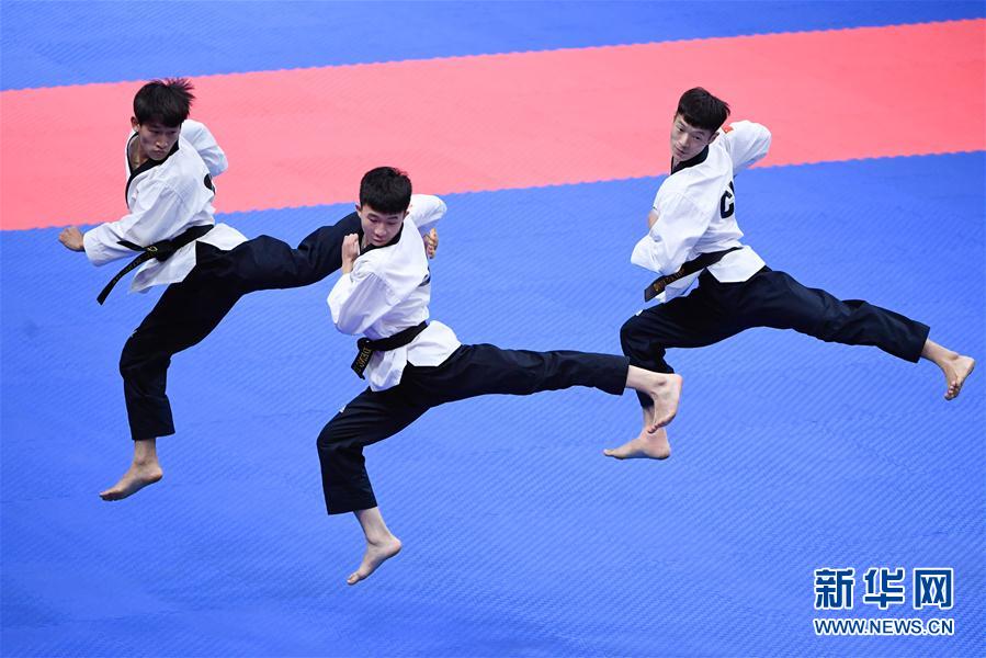 ↑8月19日,中国队选手在比赛中。 当日,在印度尼西亚雅加达举行的第18届亚运会跆拳道品势男子团体决赛中,韩国队战胜中国队,获得金牌。 新华社记者黄宗治摄