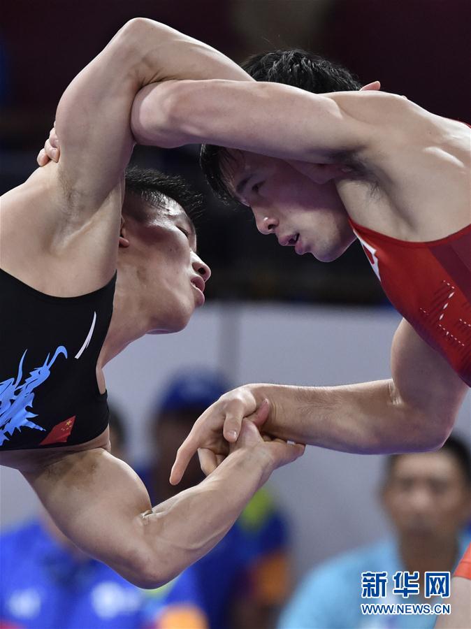 ↑8月19日,中国选手刘明瑚(左)在比赛中与对手较量。 当日,在雅加达举行的第18届亚运会男子自由式摔跤57公斤级铜牌争夺赛中,中国选手刘明瑚3比3战平日本选手高桥侑希,但因点数略低,惜失铜牌。 新华社记者李贺摄