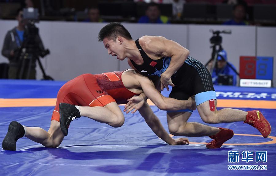 ↑8月19日,中国选手刘明瑚(右)在比赛中与对手较量。 当日,在雅加达举行的第18届亚运会男子自由式摔跤57公斤级铜牌争夺赛中,中国选手刘明瑚3比3战平日本选手高桥侑希,但因点数略低,惜失铜牌。 新华社记者李贺摄