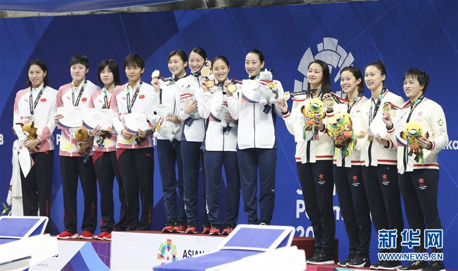 ↑8月19日,获得女子4X100米自由泳接力前三名的日本队、中国队和中国香港队在领奖台上。 当日,在第18届亚运会女子4X100米自由泳接力决赛中,日本队以3分36秒52获得冠军,中国队以3分36秒78的成绩屈居第二,中国香港队以3分41秒88获第三名。 新华社记者丁汀摄