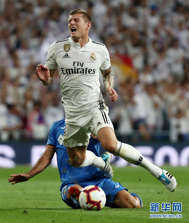 ↑8月19日,皇马队球员克罗斯(前)在比赛中拼抢倒地。 当日,在2018-2019赛季西甲联赛首轮比赛中,皇家马德里队主场以2比0战胜赫塔菲队。 新华社/路透