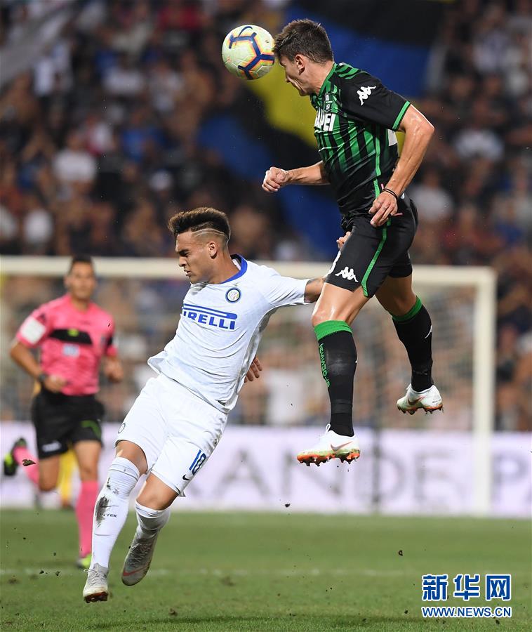 ↑8月19日,萨索洛队球员马尼亚尼(右)与国际米兰队球员劳塔罗在比赛中拼抢。 当日,在雷焦艾米利亚进行的2018-2019意甲联赛首轮比赛中,国际米兰队客场以0比1不敌萨索洛队。 新华社发(阿尔贝托·林格里亚摄)