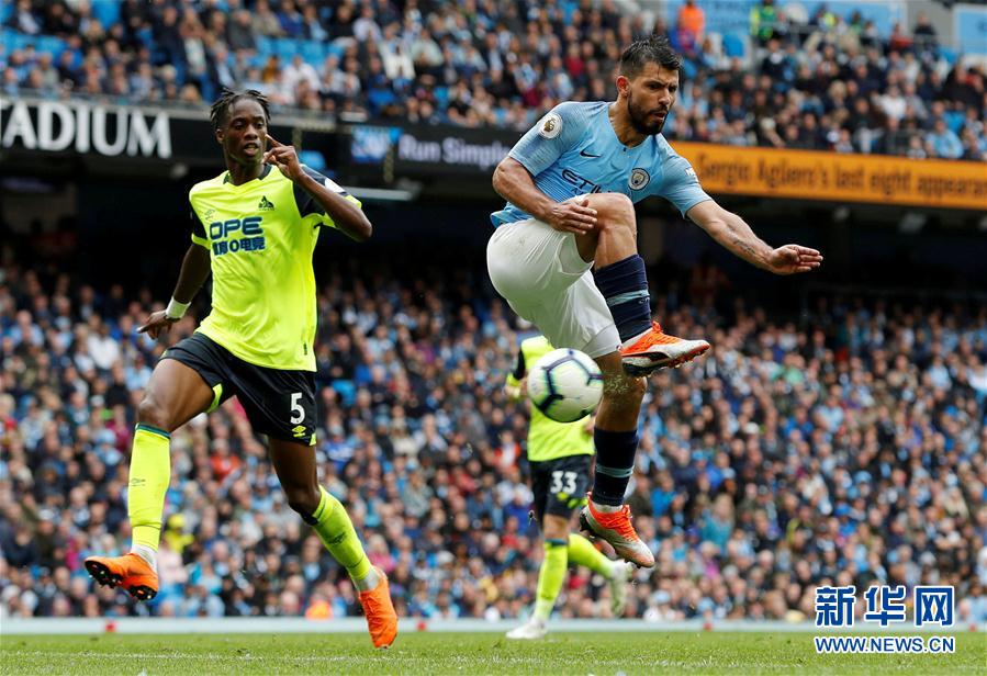 ↑8月19日,曼城队球员阿圭罗(右)在比赛中射门建功。 当日,在2018/2019赛季英超联赛第二轮比赛中,曼彻斯特城队主场以6比1战胜哈德斯菲尔德。 新华社/路透