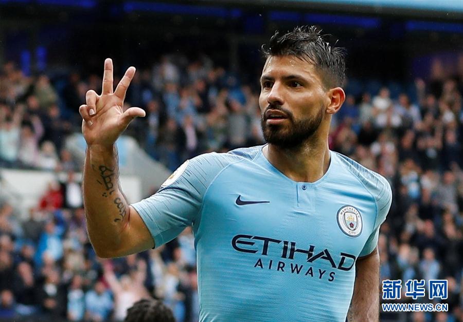 ↑8月19日,曼城队球员阿圭罗在比赛中庆祝他的第三粒进球。 当日,在2018/2019赛季英超联赛第二轮比赛中,曼彻斯特城队主场以6比1战胜哈德斯菲尔德。 新华社/路透