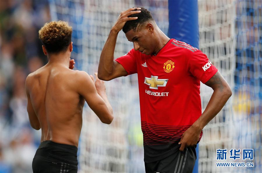 ↑8月19日,曼联队球员拉什福德(右)在比赛后。 当日,在2018/2019赛季英超联赛第二轮比赛中,曼彻斯特联队客场以2比3不敌布莱顿队。 新华社/路透