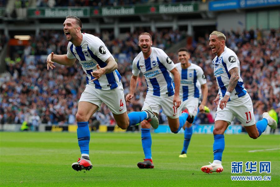 ↑8月19日,布莱顿队球员达菲(左一)进球后与队友庆祝。 当日,在2018/2019赛季英超联赛第二轮比赛中,曼彻斯特联队客场以2比3不敌布莱顿队。 新华社/路透
