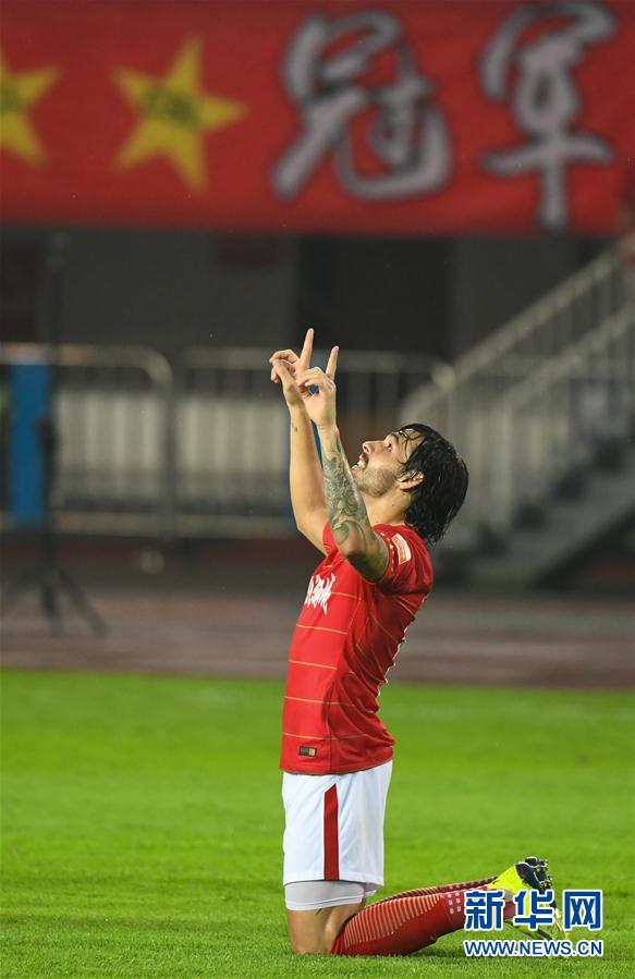 ↑8月19日,广州恒大队球员高拉特在比赛中庆祝进球。 当日,在2018中超联赛第19轮比赛中,广州恒大淘宝队主场以5比0战胜天津权健队。 新华社记者邓华摄