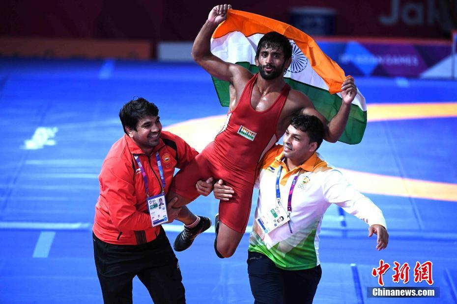 8月19日,印度选手bajrang夺得亚运会男子摔跤65公斤级别冠军。 中新社记者 王东明 摄