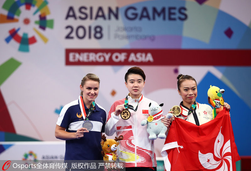 人民网北京8月20日电(李乃妍 实习生武帅男)北京时间8月20日,雅加达亚运会女子南拳南刀全能决赛颁奖仪式, 中国选手汤露为中国代表团再添一金。(Osports全体育传媒专供人民体育 版权作品 严禁转载)