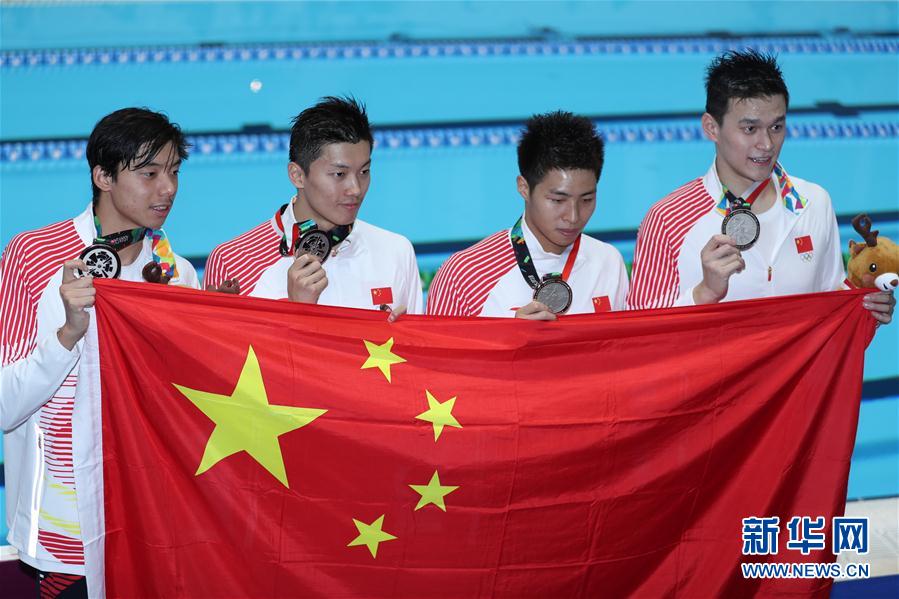 ↑8月20日,孙杨、商科元、汪顺和季新杰(从右至左)在颁奖仪式后。 当日,在第18届亚运会男子4X200米自由泳接力决赛中,中国队以7分05秒45的成绩获得亚军。 新华社记者费茂华摄
