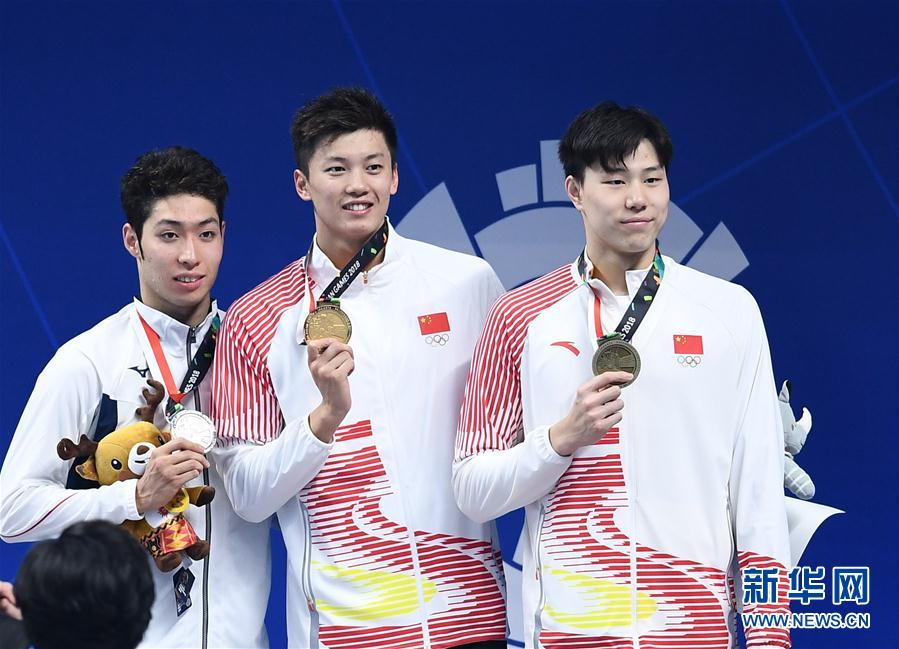 ↑8月20日,冠军中国选手汪顺(中)、亚军日本选手萩野公介(左)和季军中国选手覃海洋在颁奖仪式上。 当日,在第18届亚运会男子200米个人混合泳决赛中,中国选手汪顺获得冠军,日本选手萩野公介获得亚军,中国选手覃海洋获得季军。 新华社记者李响摄