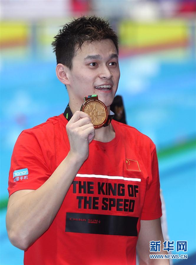 8月20日,中国选手孙杨在颁奖仪式后展示奖牌。 当日,在第18届亚运会男子800米自由泳决赛中,中国选手孙杨以7分48秒36的成绩夺冠。 新华社记者费茂华摄