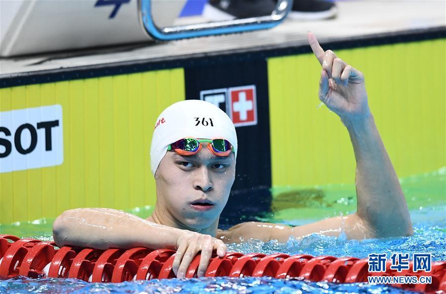 8月20日,中国选手孙杨在赛后庆祝。 当日,在第18届亚运会男子800米自由泳决赛中,中国选手孙杨以7分48秒36的成绩夺冠。 新华社记者李响摄
