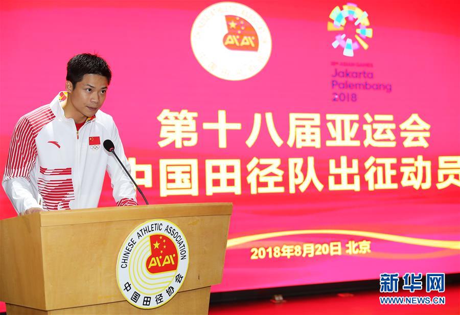 ↑8月20日,运动员代表苏炳添在出征仪式上发言。 当日,中国田径队亚运会出征仪式在北京国家体育总局训练局举行。 新华社记者王东震摄
