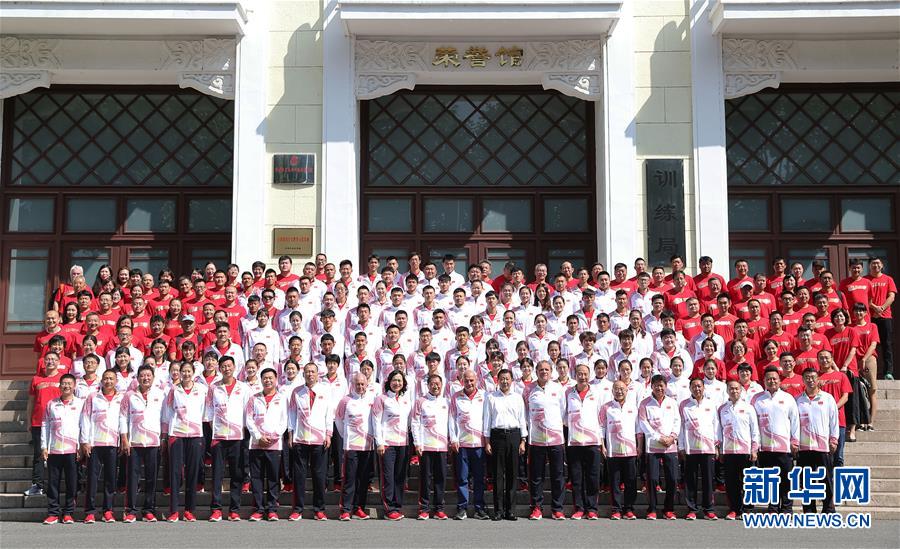 ↑8月20日,出席出征仪式的田径队成员合影留念。 当日,中国田径队亚运会出征仪式在北京国家体育总局训练局举行。 新华社记者王东震摄