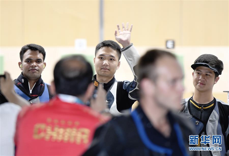 ↑8月20日,中国选手杨皓然(中)在比赛后庆祝。 当日,在第18届亚运会男子10米气步枪决赛中,中国选手杨皓然以249.1环的成绩夺冠。 新华社发(王申摄)