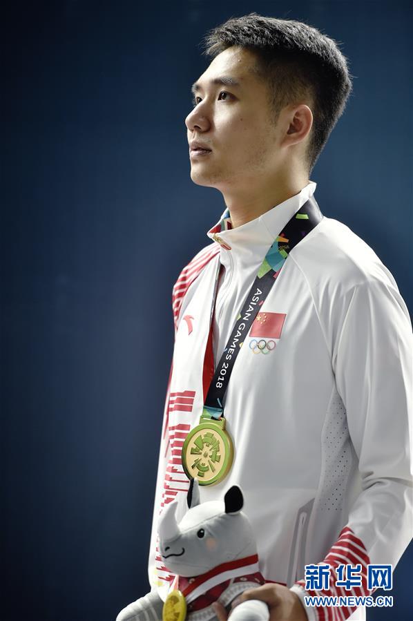 ↑8月20日,获得冠军的中国选手杨皓然在领奖台上。 当日,在第18届亚运会男子10米气步枪决赛中,中国选手杨皓然以249.1环的成绩夺冠。 新华社发(王申摄)