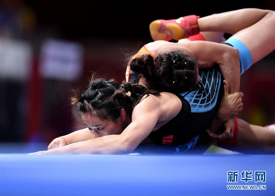 ↑8月20日,中国选手孙亚楠(下)在比赛中。 当日,在第18届亚运会女子自由式摔跤50公斤级八分之一决赛中,中国选手孙亚楠以2比8不敌印度选手维内什。 新华社记者岳月伟摄