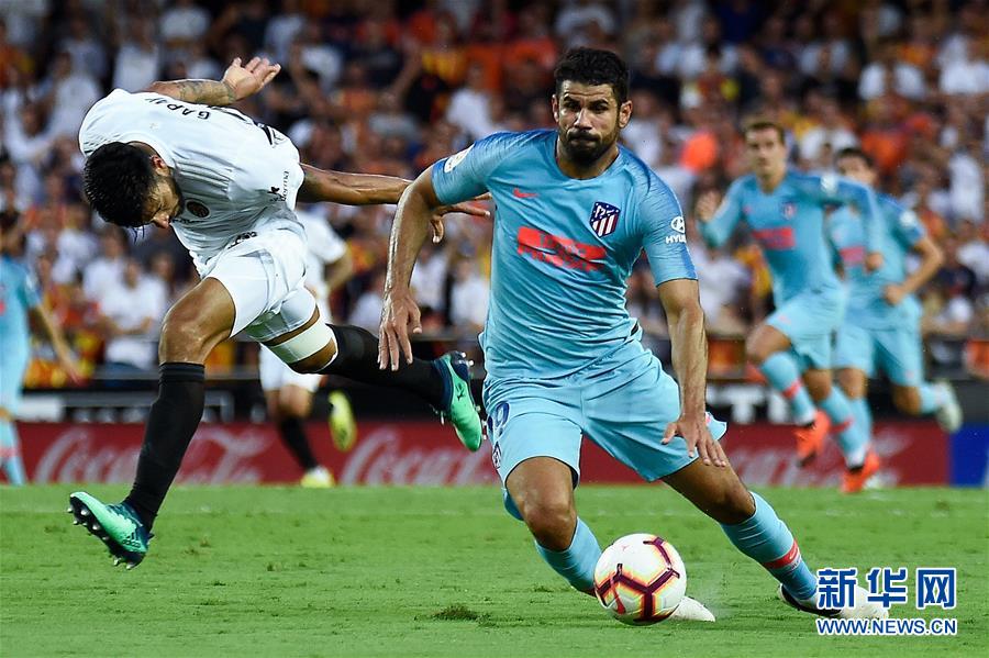 ↑8月20日,马德里竞技队球员迭戈·科斯塔(右)在比赛中带球突破。 当日,在2018/2019赛季西班牙足球甲级联赛第二轮比赛中,马德里竞技队客场以1比1战平巴伦西亚队。 新华社/法新