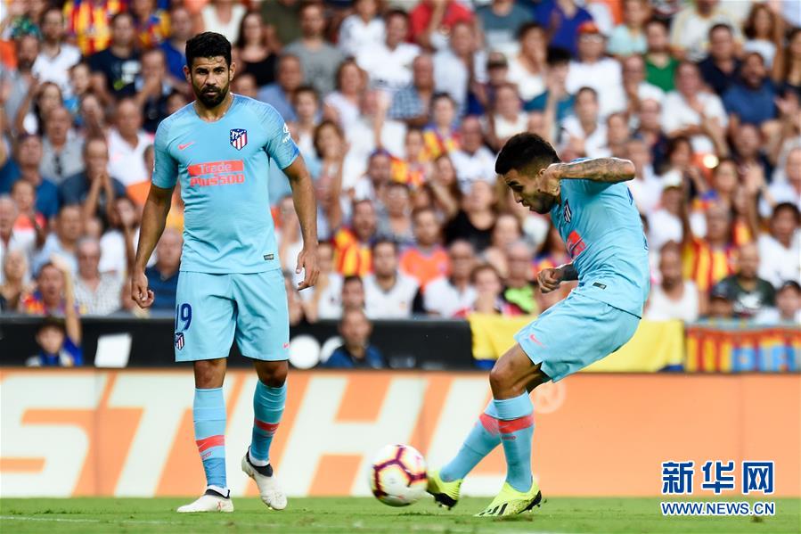 ↑8月20日,马德里竞技队球员科雷亚(右)在比赛中射门得分。 当日,在2018/2019赛季西班牙足球甲级联赛第二轮比赛中,马德里竞技队客场以1比1战平巴伦西亚队。 新华社/法新
