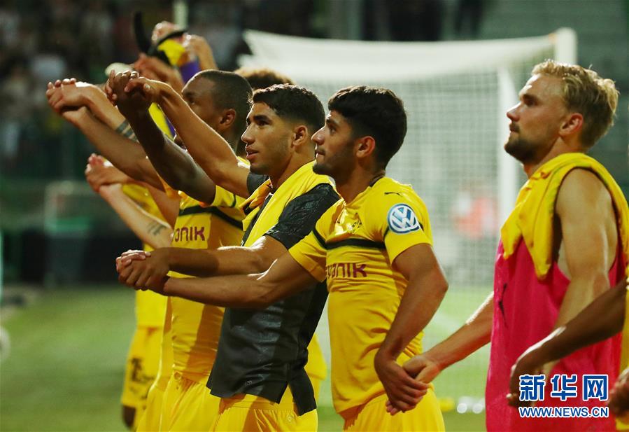 ↑8月20日,多特蒙德队球员在赛后庆祝胜利。 当日,在菲尔特进行的2018-2019赛季德国杯足球赛首轮比赛中,多特蒙德队客场以2比1战胜菲尔特队。 新华社/路透
