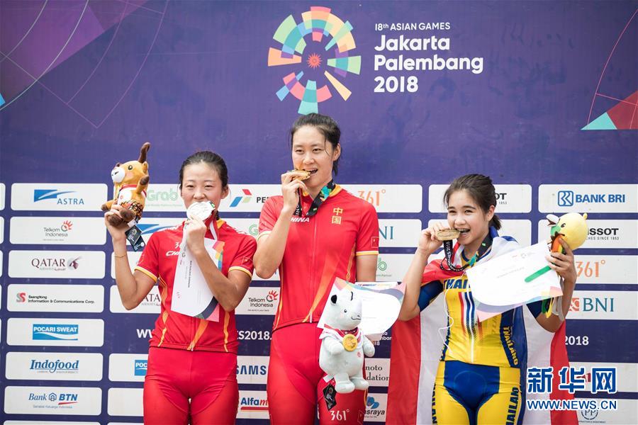 ↑8月21日,冠军中国选手姚变娃(中)、亚军中国选手李洪凤(左)与季军泰国选手娜塔莉在颁奖仪式上合影。 当日,在第18届亚运会山地自行车女子越野比赛中,中国选手姚变娃以1小时20分17秒的成绩获得冠军,李洪凤以1小时24分56秒的成绩获得亚军。 新华社记者吴壮摄