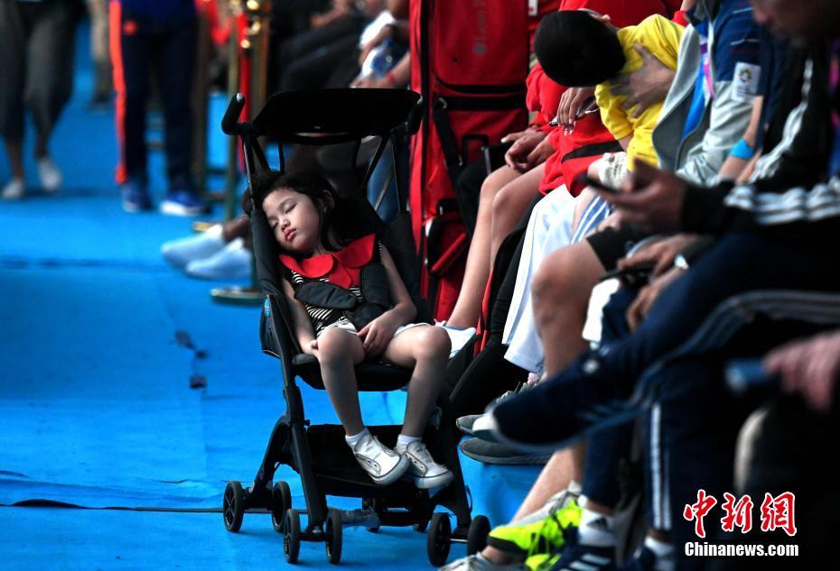 8月21日,雅加达亚运会各项赛事如火如荼举行,赛场边观看比赛的小孩睡着了。中新社记者 王东明 摄