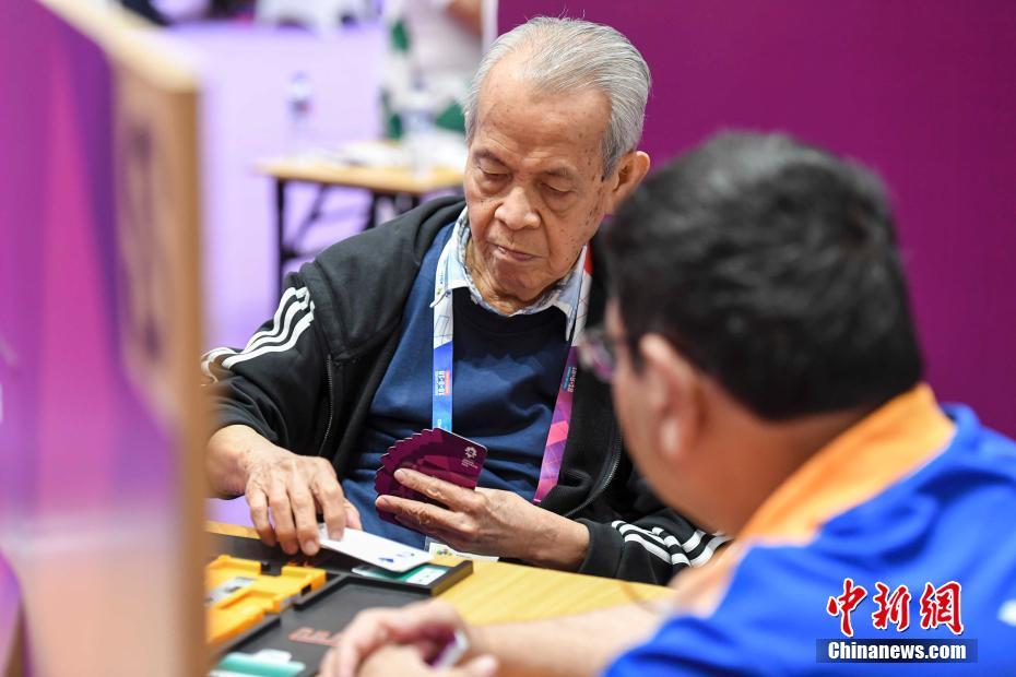 当地时间8月21日,雅加达亚运会,首次入围亚运会正式比赛项目的桥牌开赛,吸引了各国队伍参赛。其中,本次亚运会最年长的菲律宾85岁选手杨光第也参与了首日的比赛。图为菲律宾85岁选手杨光第在比赛中。中新社记者 杨华峰 摄
