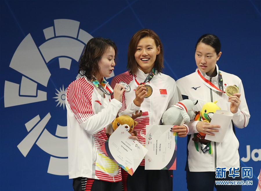 8月21日,冠军中国选手刘湘(中)、亚军中国选手傅园慧(左)和季军日本选手酒井夏海在颁奖仪式上。 当日,在第18届亚运会女子50米仰泳决赛中,中国选手刘湘以26秒98的成绩夺冠并打破世界纪录。 新华社记者丁汀摄