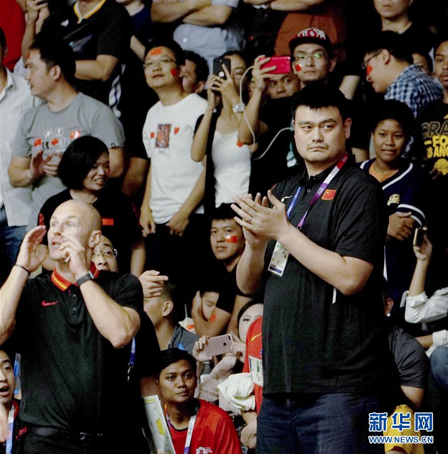 8月21日,姚明在比赛中为中国队鼓掌。 当日,在第18届亚运会男子篮球D组小组赛中,中国队以82比80战胜菲律宾队。 新华社记者王毓国摄
