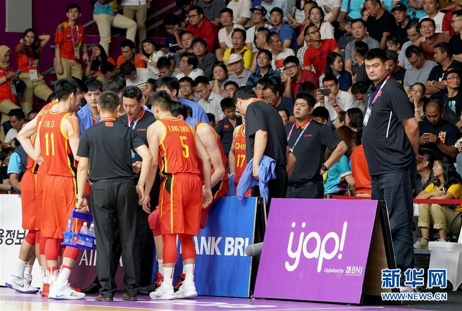 8月21日,中国篮协主席姚明(前右)在现场观战。 当日,在第18届亚运会男子篮球D组小组赛中,中国队82-80险胜菲律宾队。 新华社记者王毓国摄