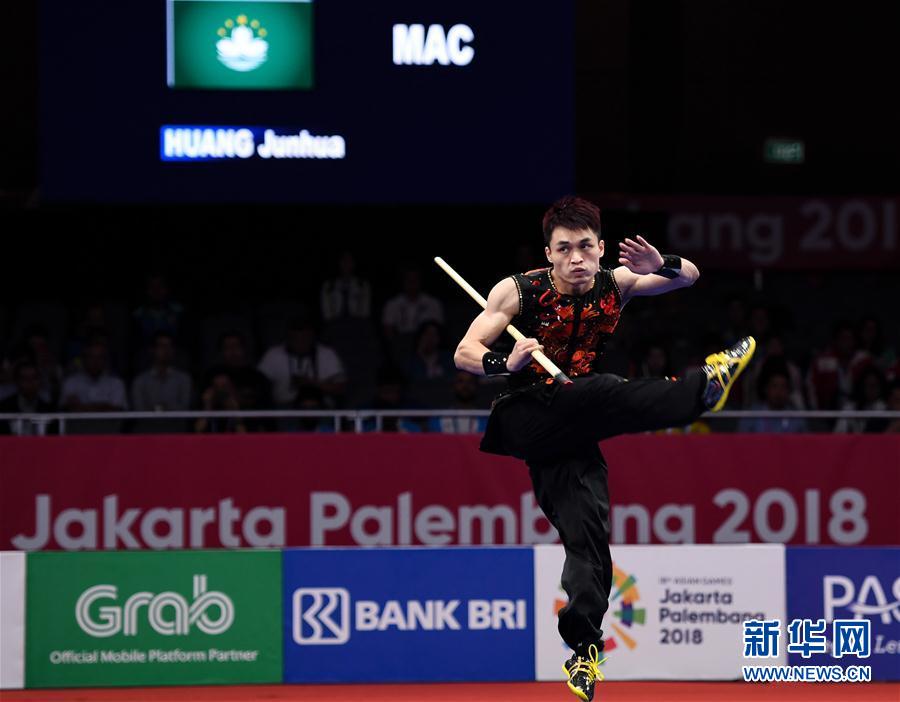 ↑8月21日,中国澳门选手黄俊华在比赛中。 当日,在第18届亚运会武术男子南拳南棍全能比赛中,中国澳门选手黄俊华获得冠军。 新华社记者张金加摄