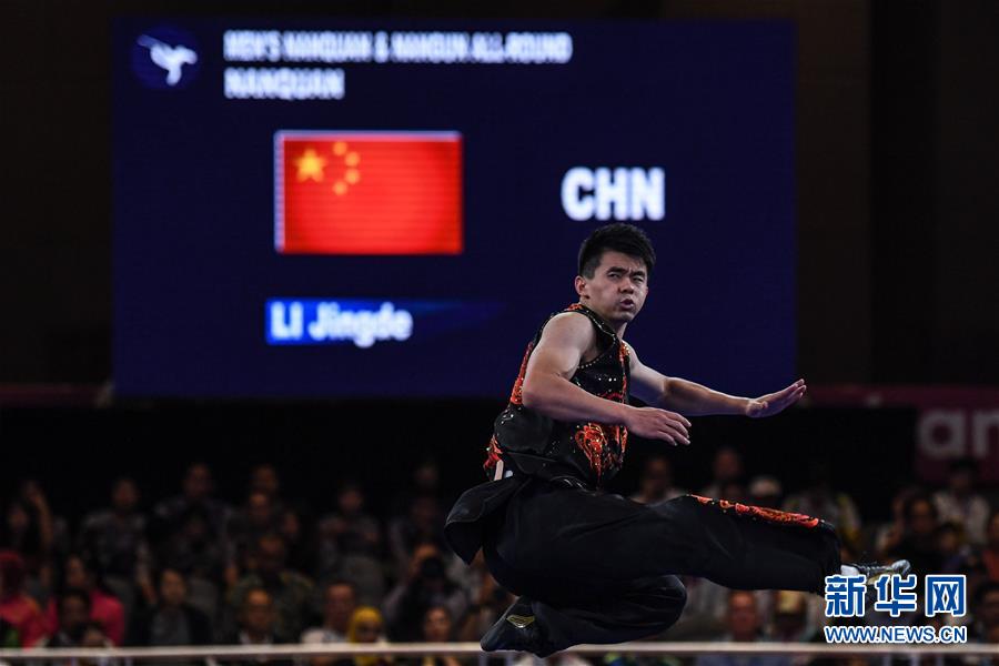 ↑8月20日,中国选手李敬德在比赛中。 当日,第18届亚运会武术男子南拳南棍全能的南拳项目比赛在雅加达国际展览中心举行。 新华社记者潘昱龙摄