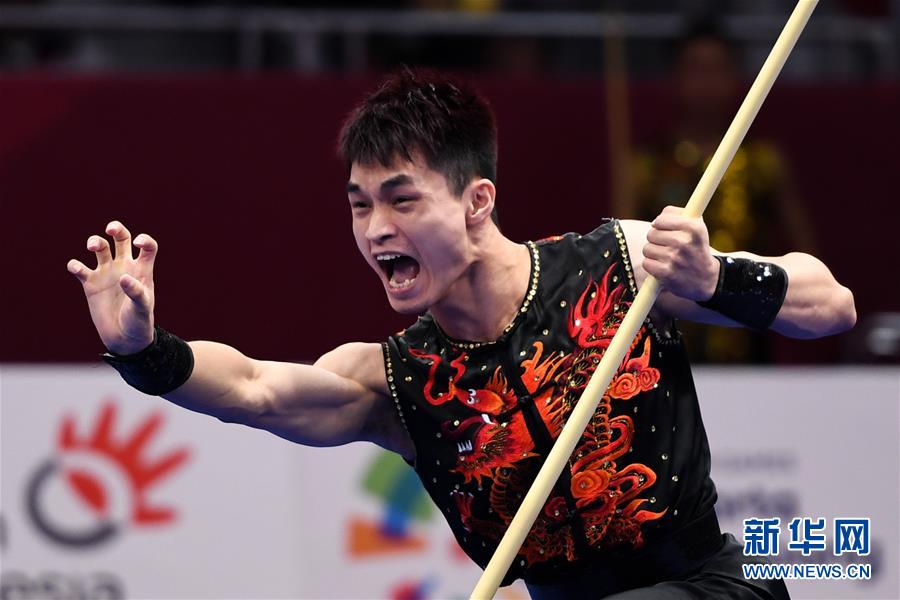 ↑8月21日,中国澳门选手黄俊华在南棍项目比赛中。 当日,在第18届亚运会武术男子南拳南棍全能比赛中,中国澳门选手黄俊华获得冠军。 新华社记者张金加摄