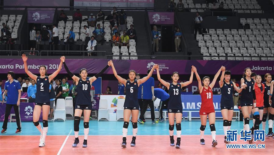 8月21日,中国队球员在赛后庆祝。 当日,在第18届亚运会女子排球B组小组赛中,中国队以3比0战胜中国台北队。 新华社记者杜宇摄