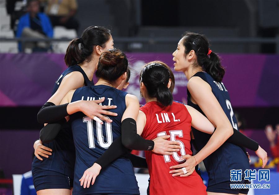 8月21日,中国队球员在比赛中庆祝得分。 当日,在第18届亚运会女子排球B组小组赛中,中国队以3比0战胜中国台北队。 新华社记者杜宇摄