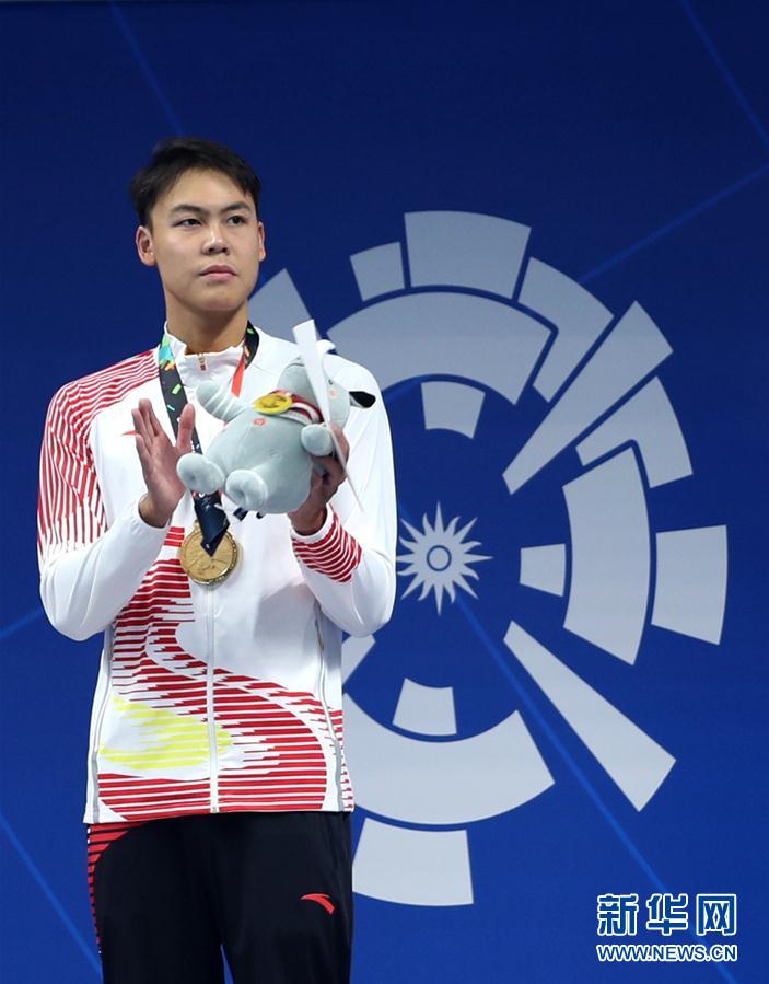 8月21日,中国选手余贺新在颁奖仪式上。 当日,在第18届亚运会男子50米自由泳决赛中,中国选手余贺新以22秒11的成绩夺冠。 新华社记者费茂华摄