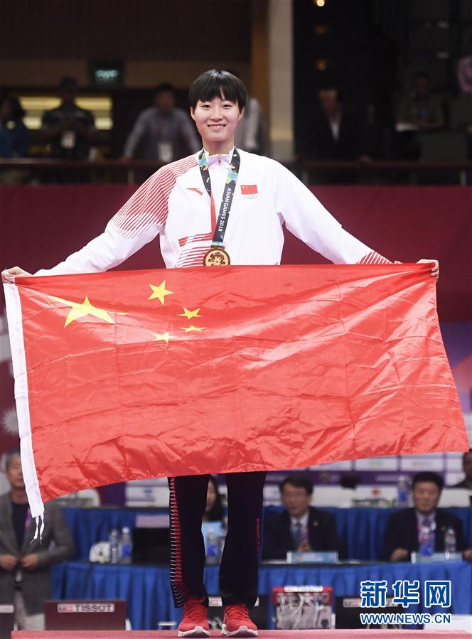 8月21日,中国选手骆宗诗在颁奖仪式上。 当日,在印度尼西亚雅加达举行的第18届亚运会跆拳道女子57公斤级比赛中,中国选手骆宗诗以6比5战胜韩国选手李雅琳,获得金牌。 新华社记者黄宗治摄